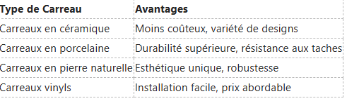 Ceci vous permet de peser le pour et le contre de chaque type lors de votre choix. En gardant cela à l'esprit, vous pourrez sélectionner le type de carreau qui répond le mieux à vos besoins spécifiques.
