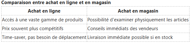 Votre choix entre un achat en ligne ou en magasin dépend de plusieurs facteurs. L'achat en ligne peut offrir une plus grande variété et souvent des prix compétitifs ; cependant, il vous prive de la possibilité de toucher et de visualiser les produits en personne. En magasin, vous bénéficiez de conseils en temps réel et d'une expérience tangible qui peut influencer votre décision.