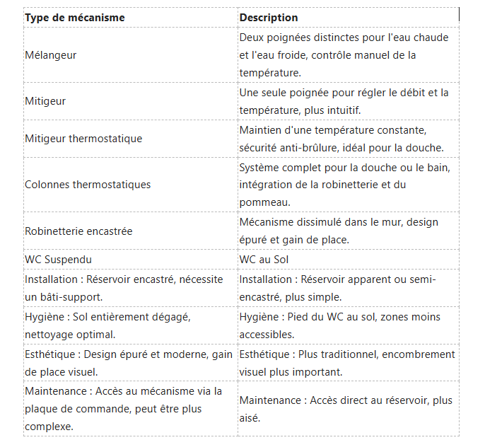Choisir la bonne robinetterie est essentiel pour votre salle de bain. Vous avez le choix entre plusieurs mécanismes, chacun offrant des avantages distincts. Le mixeur , avec ses deux poignées (eau chaude et eau froide), est un classique qui apporte une touche rétro à votre intérieur.