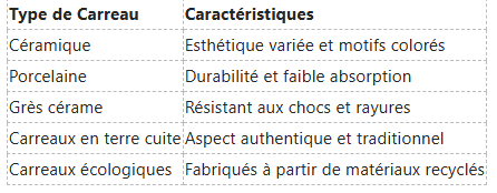 Les carreaux se déclinent en de nombreuses textures, chacune apportant une personnalité unique à votre intérieur. Parmi les types les plus courants, vous trouverez des carreaux lisses, rugueux, et en relief. Les carreaux lisses sont souvent choisis pour leur aspect moderne et épuré, tandis que les carreaux rugueux ajoutent une sensation de rusticité et de chaleur. En outre, les carreaux en relief peuvent attirer l’attention sur certaines surfaces et créer des effets de lumière uniques.