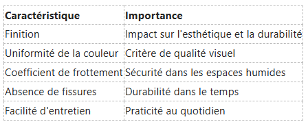 Les carreaux italiens de qualité se caractérisent par leur finition impeccable et leur résistance au passage du temps. Lors de votre sélection, portez attention aux détails tels que l'uniformité de la couleur et l'absence de fissures. De plus, une surface bien polie indique une fabrication soignée qui favorisera la durabilité de vos installations.