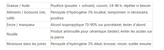 Les taches organiques (café, vin) répondent souvent au peroxyde d'hydrogène 3% appliqué localement puis tamponné, tandis que les taches d'encre peuvent nécessiter de l'alcool isopropylique 70-90% sur carreaux émaillés. En revanche, n'utilisez pas d'oxalique ou d'acide chlorhydrique sur la pierre naturelle sans avis professionnel : ces produits peuvent décolorer ou corroder la surface.