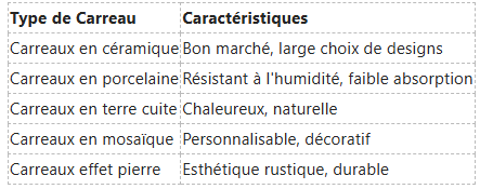Il y a aussi les carreaux en terre cuite qui apportent une chaleur et une texture uniques à votre salon. Enfin, les carreaux en mosaïque offrent une multitude d'options de personnalisation, transformant des espaces ordinaires en œuvres d'art. La variété permet de répondre à différents styles et besoins décoratifs. La polyvalence de ces carreaux garantit qu’ils peuvent s’adapter à divers thèmes de conception.