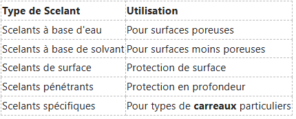 Il existe plusieurs types de scelants adaptés aux différents types de carreaux italiens. Les scelants à base d'eau sont idéaux pour les surfaces très poreuses, tandis que ceux à base de solvant offrent une protection renforcée pour des surfaces moins poreuses. L'utilisation du bon scelant est cruciale pour assurer une protection adéquate. Choisir le bon produit dépend de la nature de vos carreaux et de leur emplacement.