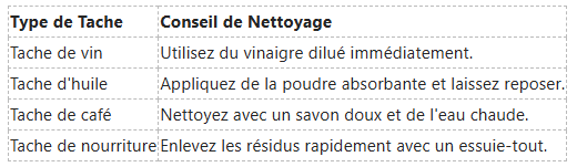 Il est conseillé d’intégrer une vérification hebdomadaire plus approfondie pour enlever les taches persistantes. Utilisez des techniques spécifiques pour les différents types de taches, en veillant à respecter les recommandations des produits que vous utilisez.