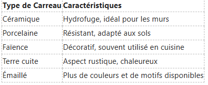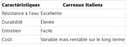 Type de Revêtement Caractéristiques Carreaux Italiens Durabilité, variété de designs, entretien facile Carreaux Traditionnels Coût inférieur, mais moins de design et de durabilité Bois Chaleur naturelle, mais sensible à l'humidité et aux rayures Autres Revêtements Polyvalence, mais souvent moins résistant Avantages et Inconvénients des Autres Matériaux