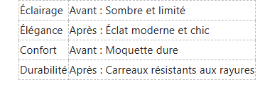 Voici un tableau qui compare l'ambiance d'un salon avant et après l'installation des carreaux italiens :