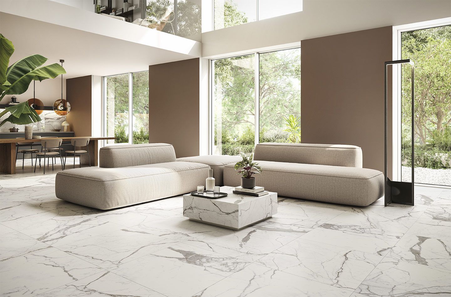 En choisissant des dalles grand format, vous minimisez les joints et créez une continuité visuelle qui agrandit les volumes et simplifie l'entretien, un atout pour les lieux à fort trafic.