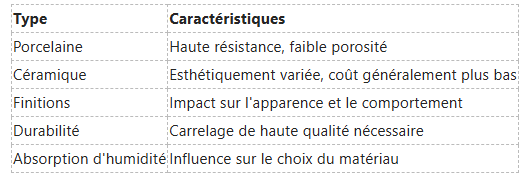 A: Il faut prendre en compte l'utilisation prévue de l'espace (intérieur ou extérieur), le niveau de passage, et les besoins en entretien. Par exemple, un carrelage anti-dérapant est préférable pour les espaces humides comme les salles de bains ou les cuisines.