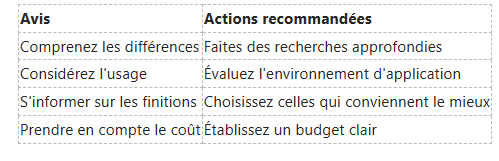Le choix d'une finition inappropriée peut également entraîner des coûts supplémentaires à long terme, car vous pourriez avoir besoin de remplacer le carrelage plus tôt que prévu. Ainsi, il est essentiel de bien évaluer les options disponibles avant de faire votre choix final.