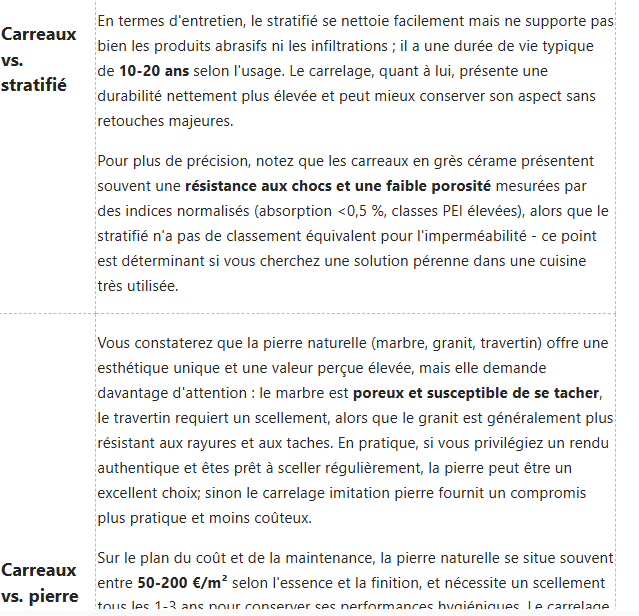Comparaison avec d'autres matériaux de revêtement de cuisine