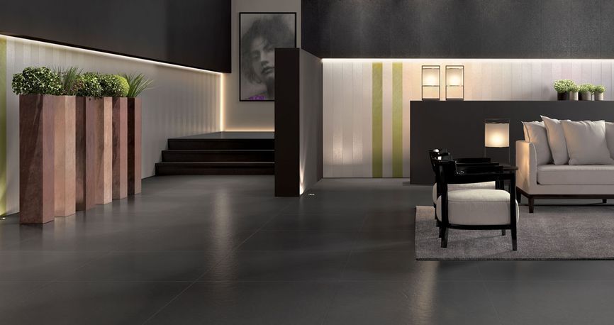 Le gris minéral se prête merveilleusement bien aux grands formats de carreaux, accentuant son effet de continuité et d'espace, et créant ainsi une base solide et élégante pour tout type de mobilier moderne.